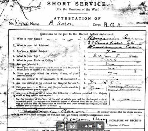 Benjamin served in the Royal Garrison Artillery during the First World War, and the extract below from his service record, dated 1915, gives his address as 23 Crossfield Street, Woodhouse. His Regimental Number was 66940.