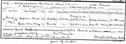 On returning from military service, Benjamin married Roaslie Marie Marny at Addingham on 8th February 1919. The details on the marriage certificate show that he was now living at Brickfields, Gildersome, but was still working as a clerk. His father George is listed as a Gentleman, that is, having an independent income, as he also was in the 1901 Census. Rosalie’s father, Augustin, is listed as an Agriculturalist.