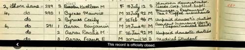 The image below is the entry in the 1939 England & Wales Register. The family were living at 6 Thorn Lane, Leeds. Benjamin is listed as head of an insurance department, and Frank is listed as a medical student. The record below, which is closed, is likely to be his brother Arthur Aaron, who was in the Royal Air Force, and will be covered in more detail later.