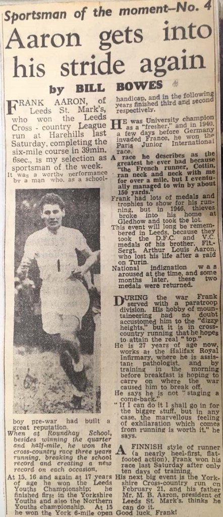 The story of Arthur Louis Aaron and his bravery in World War II is quite well known in the history of Leeds, but perhaps less well known are his connections to St Mark’s Harriers.