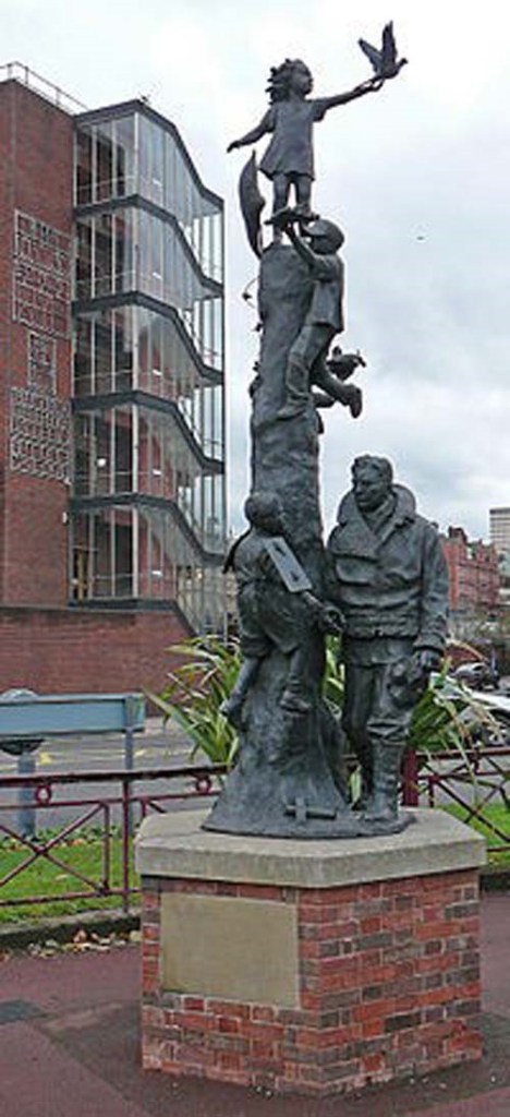 In November 1943, the London Gazette published the official citation for awarding a posthumous Victoria Cross, the highest award for gallantry in British and Commonwealth forces, and in 1944 his parents received his medal from King George VI at Buckingham Palace. In 1946, his parent’s home was burgled and his medals stolen, although they were later returned anonymously in the post after a Police appeal. In 1953, Benjamin Aaron presented Arthur’s medals to Leeds City Museum, where they remain. He was the only Leeds native to be awarded the VC during World War II. There is a plaque in the main hall at Roundhay School in his memory, and a memorial scholarship in architecture in his honour, still awarded in the 21st century. In 2001, a five-metre bronze sculpture by Graham Ibbeson was installed on the roundabout at the bottom of Eastgate, in the city centre. It depicts Aaron standing next to a tree, at the top of which a girl is releasing a dove of peace, and was unveiled by Malcolm Mitchem, the last survivor of Aaron’s aircraft.