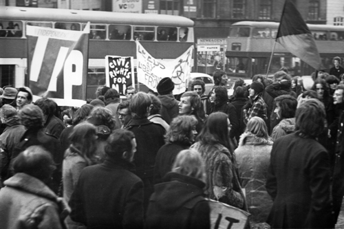 A banner carried by the Leeds Gay Liberation Front can be seen in this photograph of a protest march on the Headrow in support of the people of Northern Ireland, following the Bloody Sunday killings of January 1972. The Leeds branch of the GLF was established in the early 1970s to promote equality and organise fundraising and social events for gay people. The group met at the University of Leeds student union on Friday nights, followed by drinks at the Fenton pub on Woodhouse Lane, just a few doors down from their campaign headquarters, which opened in December 1973. The GLF were active until 1974-75 when they merged with the university’s student-run Gay Society.