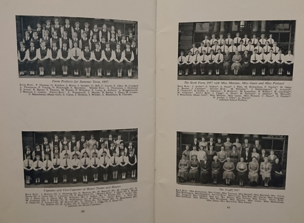 Finally moving to the modern day, which for this magazine was 1957, there are four special student and staff photographs to commemorate the fifty year of the school.  These photographs include The Form Prefects for Summer Term 1957, Captains and Vice Captains of House Teams and Houses, The Sixth Form with Teachers Miss Menzies, Miss Guest and Miss Pickard and a Staff Picture in 1957. This magazine does a excellent job of preserving and contextualising the past while commemorating the present. these ‘current’ photographs show how the school has changed and stayed the same in the past fifty years.
