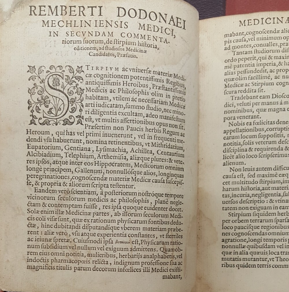 The earliest herbal we have in our collection is by Rembert Dodoens who was born in Flanders in 1517. He became personal physician to the Holy Roman Emperor, Maximillian II, spending time in Vienna and Prague. He later resigned (he didn’t like Prague) and went to live in Cologne and this is where he published several botanical and medical writings.