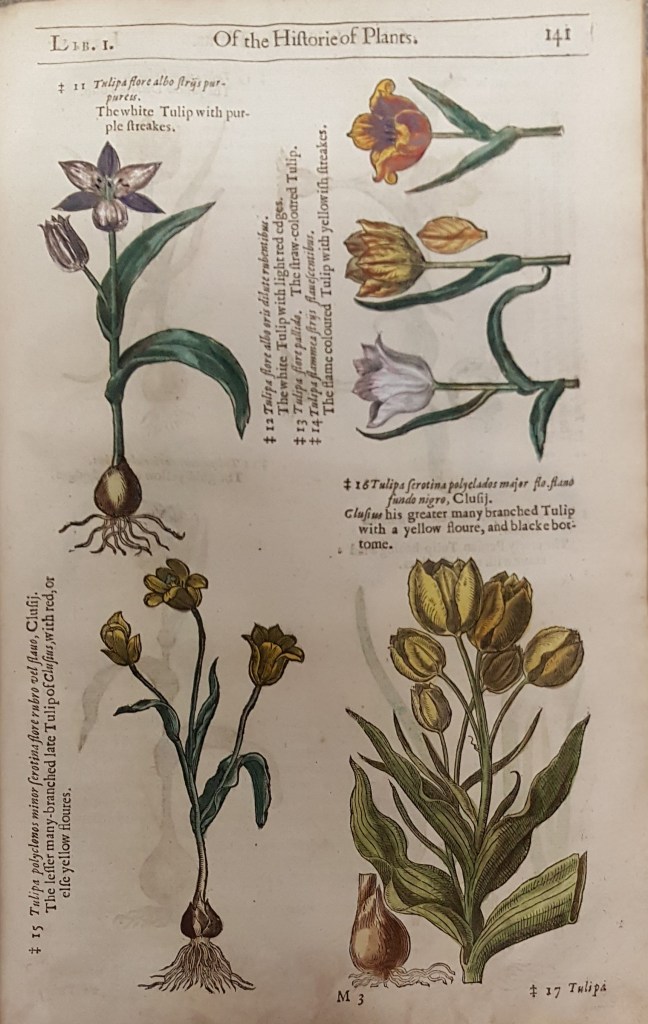 A later edition 1636 is only partially coloured in which suggests that it was the reader that coloured it in themselves, perhaps as a way to record plants he or she had seen in person. There are lots of marks in the margin and I even found a pressed plant in the pages of this copy which I think supports the idea that it was a working copy. It is really amazing to see these additions from past readers.