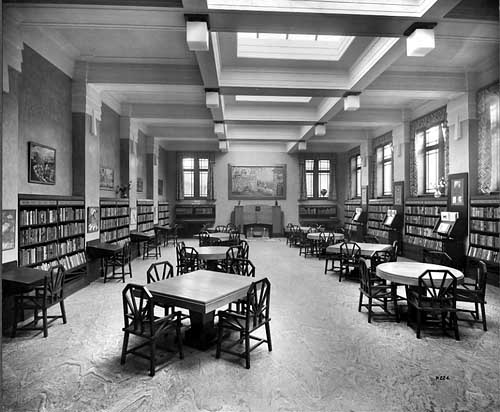 I loved this library. Grew up with it in the 1960’s, visiting on my own most Saturdays. The entrance area had large `lecterns’ for reading the newspapers. There was a separate adult and children’s part. I remember beautiful oak lined rooms, brimming with bookcases. Parquet floors, huge coal fire in children’s library where I used to sit for hours looking at National Geographic’s and Reference books. The Children’s library had sloped desks for study and a wonderful smell of wood and books. – Anonymous, 2011, www.leodis.net