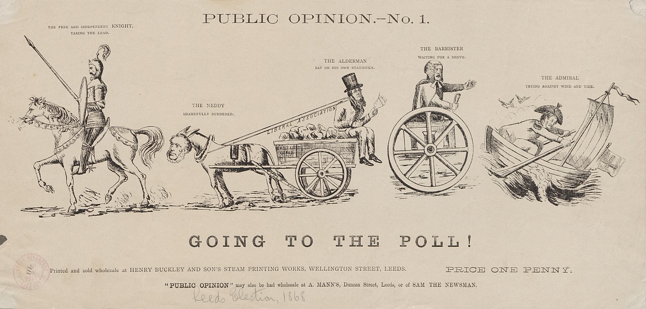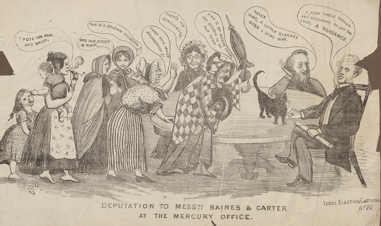 The same story – that same process of wielding language to define and control the discourse shaping the identities and lived experiences of women – plays out in the image below, from our collection of 19th-century Political Cartoons. This cartoon is from the 1874 parliamentary election for Leeds and shows a group of women attempting to meet with two Liberal M.P.’s for Leeds, Edward Baines Jnr and Robert Meek Carter.