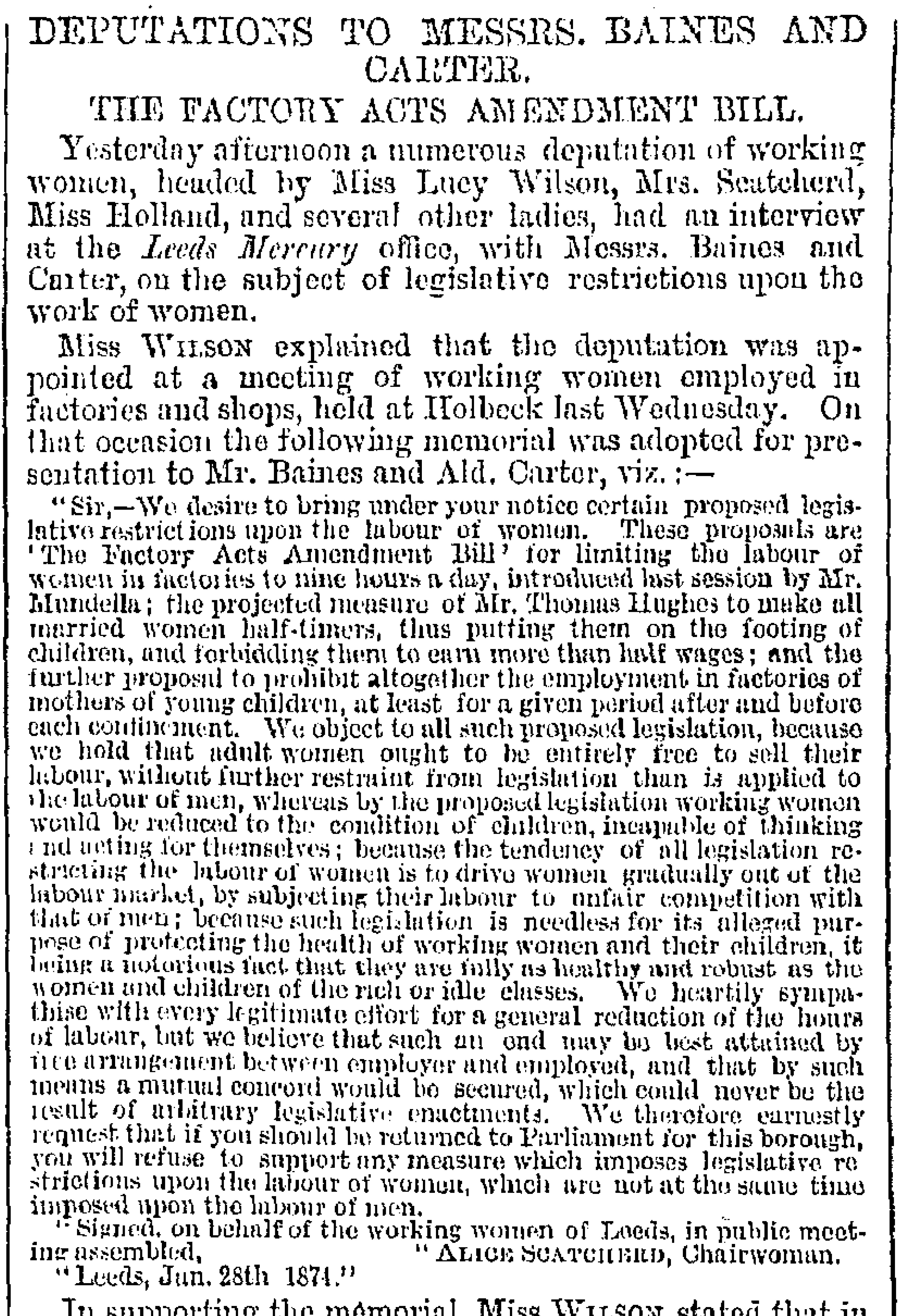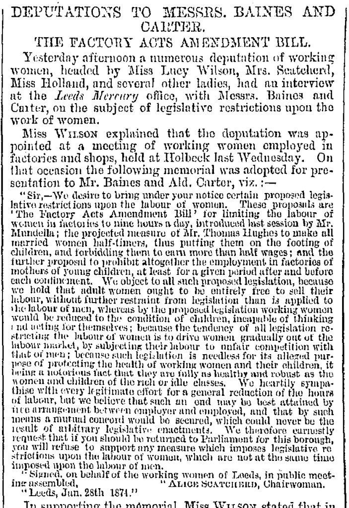 We know exactly why this meeting took place as there is a contemporary newspaper record of its occurrence: in February of 1874, women from Leeds factories and workshops, along with middle-class supporters – such as Alice Cliff Scatcherd, a social reformer, champion for women’s rights, two-time Lady Mayoress, animal welfare campaigner, teacher, organiser and public speaker, whose scrapbook of newscuttings about her campaigns we hold at the Central Library – asked for the support of Baines and Carter in challenging the Nine Hours Factory Bill that proposed to limit the time women and children could work to nine hours a day. Their opposition focused on the limit the bill put on women’s right to work and earn as much money as men.