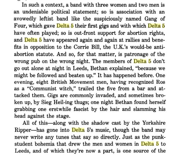 The broader context for the scene Delta 5 emerged from was a swirling current of left-wing, radical activism meeting an-equally strong barrage of far-right violence in 1970s Leeds. Much of that violence was directed at women. This was the era, of course, of the Yorkshire Ripper – but beneath that headline name were frequent assaults on women, including by the neo-Nazis that attacked Delta 5 outside a pub in Leeds, verbally abusing one member of the group, Ros Allen, as a “Communist witch”, as we learn on page 156 of cultural critic Greil Marcus book In the Fascist Bathroom: Writings on Punk, 1977-1992.