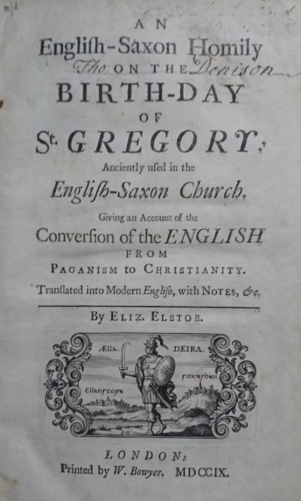 In particular, Elizabeth was an accomplished translator, including of the English-Saxon Homily on the Nativity of St Gregory in 1709, a copy of which we hold at the Central Library. Elstob was part of a flourishing ‘republic of letters’ among antiquarians in the early 18th-century, frequently collaborating with major names such as Humfrey Wanley and George Hickes.