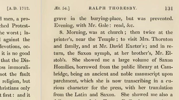 In fact, one antiquarian she was associated with was Leeds’ very-own Ralph Thoresby – the author of the Ducatus Leodiensis, the first written history of Leeds. In his diary, Thoresby records visiting the home of Elstob and her brother William in 1712. We know this because Thoresby writes of visiting at “her brother’s, Mr. Elstob’s.”