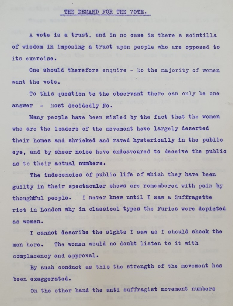The image above shows a page from the papers of James Armitage, of Armitage and Wight, family butchers of Leeds. Amongst other documents in his collection are pages of notes against women having the vote. Here, Armitage displays a deep-rooted fear of women becoming ‘masculinised’ and how feminism could eventually disrupt the entire social order by undermining domestic life. Armitage uses typical anti-Suffrage arguments such as the biological differences between men/women and says that the leaders of the suffrage movement ‘shrieked and raved hysterically’ in contrast to how he believes women should behave in public.