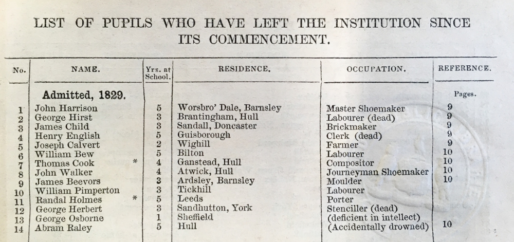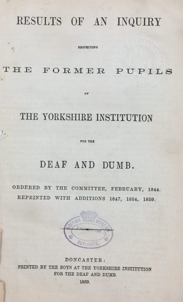 Another report in the Local History Library reveals that deaf people were regularly employed in the textile industry around Yorkshire. Results of an Inquiry Respecting the Former Pupils of the Yorkshire Institute for the Deaf and Dumb (1844, reprinted with additions 1859) aimed to prove the effectiveness of the school’s educational methods by showing that pupils went on to be useful members of society in various trades. The institute sent a questionnaire to employers, families and other contacts.