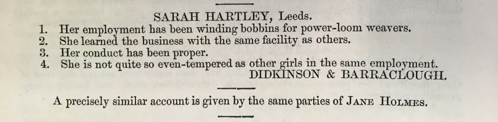 Sarah Hartley and Jane Holmes were both employed as bobbin-winders at Dickinson and Barraclough in Leeds. While they learned the trade well, they were “not quite so even-tempered as other girls in the same employment”.