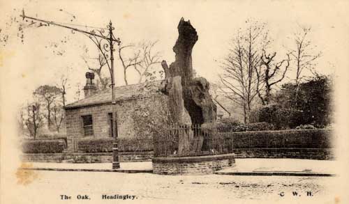 C 1903. Postcard view of Shire Oak on Otley Road, the tree that was an important focal point at the centre of Headingley for many years. Now decaying, it has railings around to protect it. The tree finally collapsed on 26th May 1941. In 1956 another oak was planted nearby in the grounds of the Original Oak Inn, but the old one is still preserved in St. Michael’s Church where a statue was carved from its wood. The postcard is dated 31st December 1903. (c) Leeds Libraries, www.leodis.net