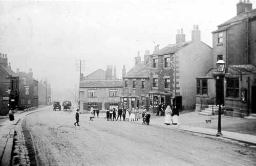 c1900s. Image shows the local tradition of the ‘New Year’s Scramble’ on Churwell Hill, Elland Road. Dave Morley, ‘The Teacake King’ who also specialised in wet fish, had a special treat for children on New Year’s Day. He would heave a shovelful of pennies in his baker’s oven until red-hot, then let the children scramble for them on the pavement. The Old Fleece is shown at the right edge. It had its entrance at the back and was demolished in 1934. Information from the writings of Bob Dennis, research by Ronnie Barraclough. Photograph from the David Atkinson Archive. (c) David Atkinson, www.leodis.net