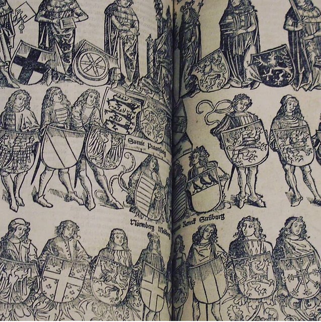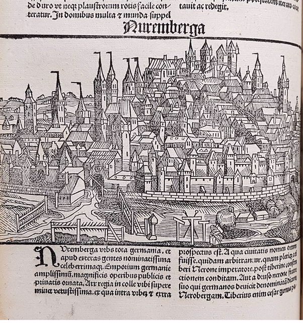 We’ll begin with one of our oldest texts, The Nuremberg Chronicle is the most extensively illustrated book of the 15th century. This masterpiece depicts the history of the Christian world from the beginning to the 1490s in a manner typical of medieval Chronicles. Originally printed in 1493, our copy is a later, smaller ‘pirated’ edition from 1497 making it one of our Incunabula treasures. Although not as lavishly illustrated it still contains many wonderful images of people and places. Our copy also has lots of unique marginalia and even the ghostly imprint of a key kept between the pages.