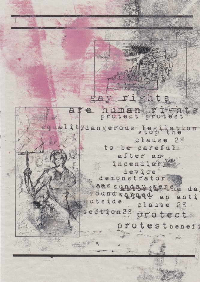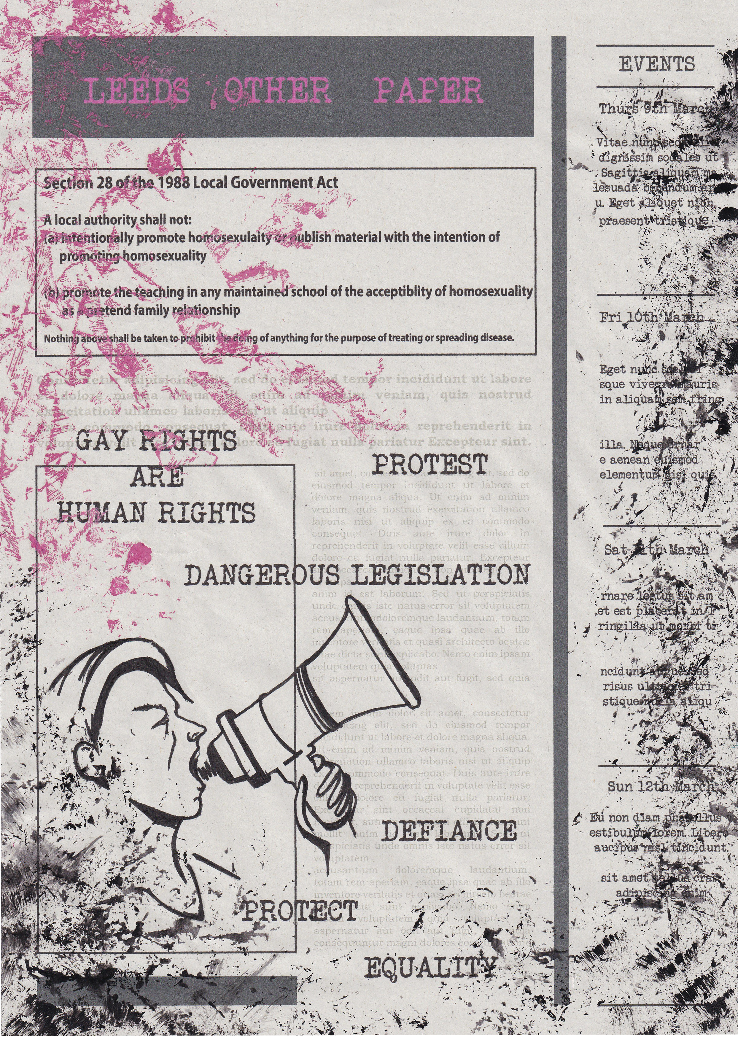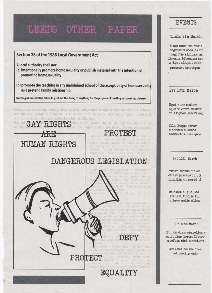 The Other Project, co-ordinated by Third Year Fine Art student Mia Ferullo, is a collaboration between Leeds Central Library and York St John University’s second year students. The students were divided into four groups, each being given an issue of the Leeds Other Paper. With a combination of Fine Art, Photography and Illustration students, this project displays a range of works that explore the topics and content of the Leeds Other Paper during the 1970s and 80s. This first blog includes responses to issue 521 which was released 11th March 1988, with the main article drawing attention to protests against Clause 28.