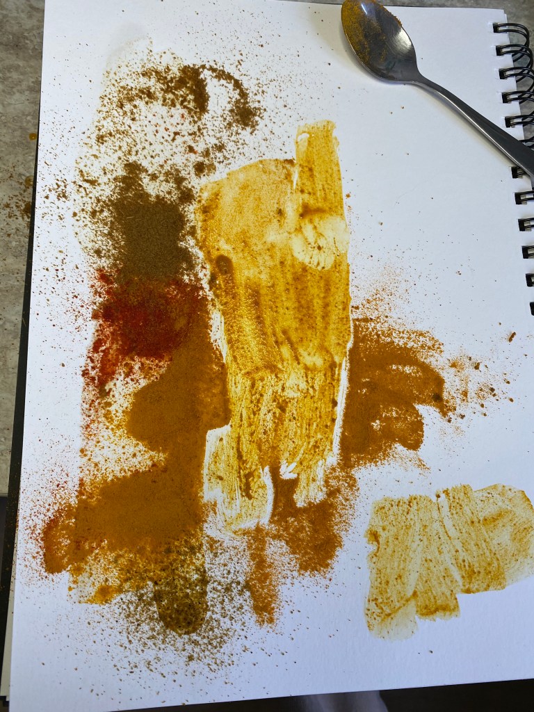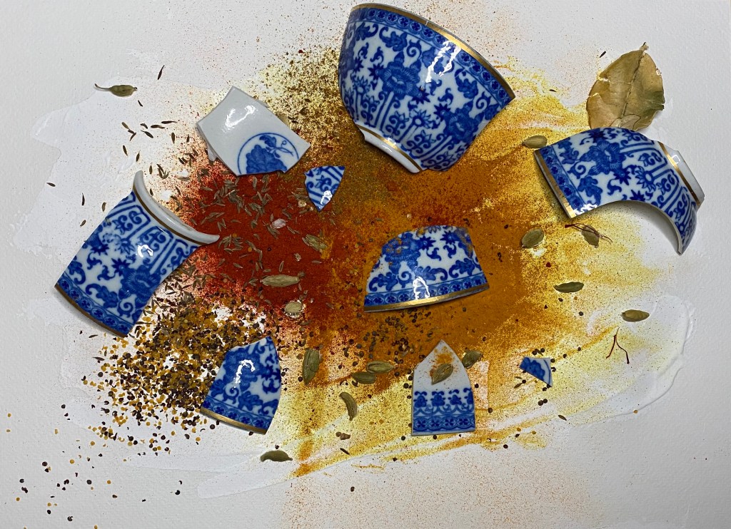 I used a bowl to represent Humanity and the act of care through cooking and giving food. It holds powerful memories when associated with childhood, family and friends, which can bring comfort to many. Spices represent the Bangladeshi community and the issues in Britain’s past and present around immigrants and other countries. However, the bowl is broken its contents spilled…the question is then “How do we collectively repair humanity?”