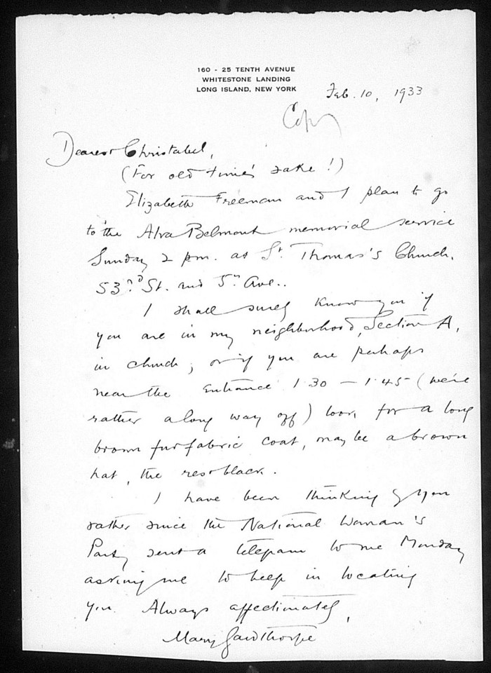 There is a letter to Christabel Pankhurst in 1933 asking if Christabel was attending the memorial service of Alva Belmont. Belmont was a millionaire socialite and major figure in the American suffrage movement and her funeral was attended by many suffragists and had all female pall bearers. Gawthorpe has little faith that Pankhurst will recognise her – presumably it had been some time since they last met – so asks her to ‘look for a long brown fur fabric coat, maybe a brown hat, the rest black’