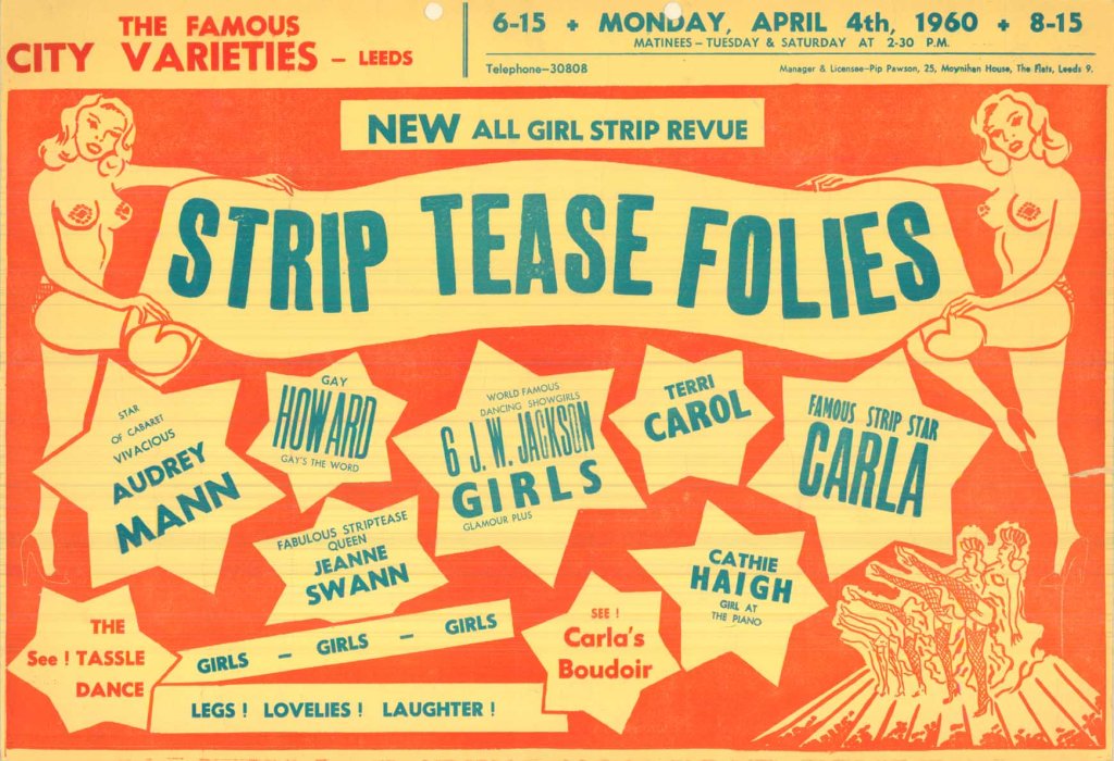 Our playbills imply a level of debauchery and raunchiness at Leeds City Varieties, with nudity and strip-tease featuring prominently. Mann herself didn’t strip, but knew many who did. ‘There were a lot of strip shows around, but we weren’t. We were just variety performers. But there were a lot of strip shows.’ Mann never saw herself as better than these performers. ‘We didn’t look down on the other girls, it’s just what they did.’ Mann had started off dancing in the chorus, before making enough of a name for herself to go solo. ‘I wasn’t just one of the girls, I managed to become a featured performer. I did what I wanted to do.’