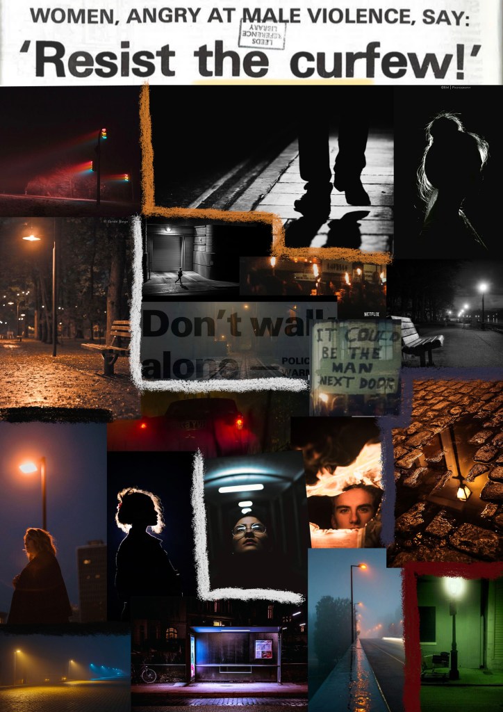 When I was given this brief, I first read the issue we were given cover to cover and highlighted key words and articles that stuck out to me. I chose to create my final piece around the story, ‘Women, angry at male violence say: ‘Resist the curfew!’. This was a really powerful collection of stories that highlighted the anger that the women of Leeds (and beyond) felt after a curfew had been suggested by West Yorkshire Police in 1980. This curfew would be imposed on the women of these communities, trapping them in their houses at night.