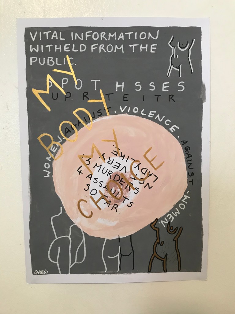 I took apart in this collaboration with Leeds Central Library and the School of Art at York St John’s. We were given an issue of the Other Paper to produce a work of art, the Leeds Other paper started around the 1970’s, distributing over the Yorkshire district. It covered events and stories happening in these areas. I was given the story covering the Yorkshire Ripper and the protests against the curfew placed on women because of the killings. For my medium I choose to use Lino printing as it created a sharp, clear image depicting silhouettes of the protest with a sign stating ‘reclaim the night’ in the centre. This was the main slogan for the protests and is still being used today regarding rape crime towards women. I added silver leaf to the sign, so it stood out against the Lino as it holds such an important message. Using the silver also links to the context of the night curfew, but also as the protests were during the night and the message had to be visible for the people to see and react to.