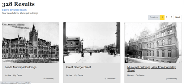 Let’s move back up to the Search bar and try that out, here you can type in anything you like, an area, a building or your home address, and Leodis will bring you back any photograph with a text description or keyword matching your search. But searching this way can bring back a lot of results. If you’re looking for something more specific select the Advanced search option to the right of the search bar.