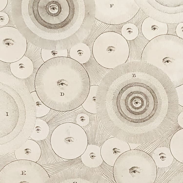 Thomas Wright’s An Original Theory or New Hypothesis of the Universe (1750) contains mezzotint engravings, likely based on his own drawings, that depict the position and movement of celestial bodies and the clusters of stars that make up the galaxies. His insights into the Milky Way predated Caroline and William Herschel’s work and was “the first to correctly postulate that clusters of starry nebulae were in fact galaxies too distant for us to discern clearly, and that the luminous blur of the Milky Way was simply an optical effect caused by our immersion in it.”[1] There is something mesmerising about the plate ‘A Finite View of Infinity’ of endless eyes that depict the ‘unlimited plenum of creations’.