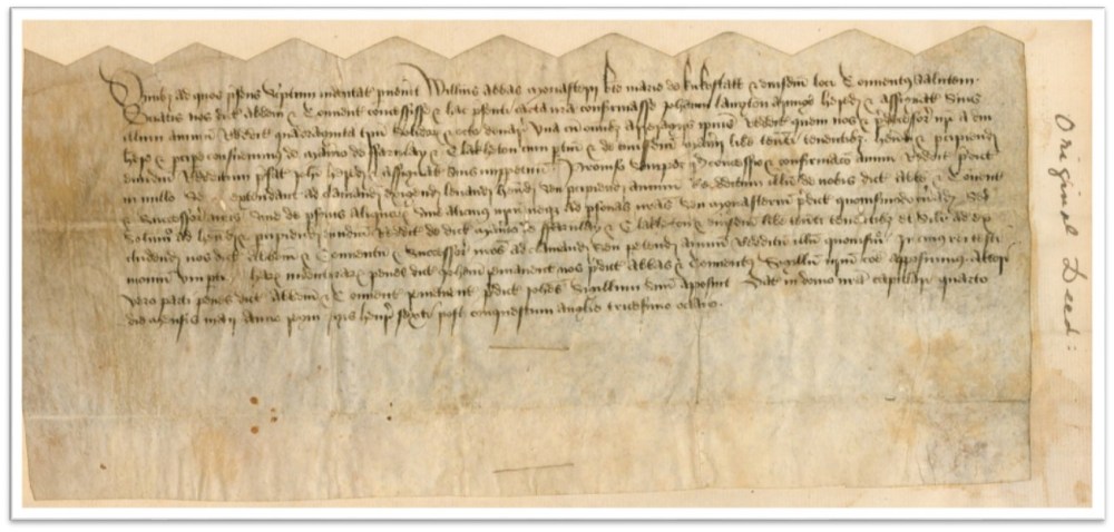 This period is represented in the Central Library collections with the item you can see below, our oldest item: an original charter from the Abbey, dated 1460.