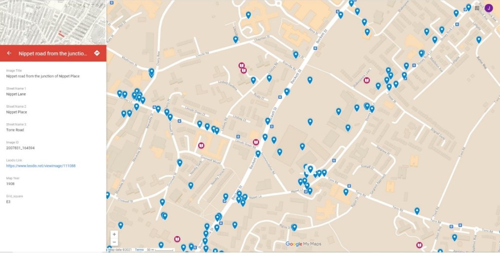 There is the obvious element of the unknown in research projects, and despite meticulous planning, that was true of this project in terms of its size. Firstly, a search for Burmantofts or Sheepscar on Leodis does not return all photographs for the neighbourhoods. Some streets that were in Burmantofts for example, were categorised as Lincoln Green, the current name for part of that neighbourhood. The cumulative effect of such examples meant that instead of an expected project size of around 800 photographs, there were in fact over 2300! With the funding and time available, it was simply not possible to expand the project to incorporate the total number so we had to prioritize our resources for maximum benefit. We excluded the West Yorkshire Archive Service (WYAS) photographs from the mapping part of the project because WYAS hold maps in their physical archive that indicate the position of each of their photographs, and therefore the information is available somewhere at least. With the Covid-19 lockdown, it was not possible to visit the archive, and it made little sense to spend time mapping what already exists. Should funding become available in future, it will be straightforward to add them to the project website. This adjustment significantly reduced the mapping part of the project, but we then encountered another demand on our time because of the Leodis archive update. As part of the project process, we had recorded the photographs in spreadsheets with their respective web addresses so they could be linked with the new Lost Streets website. Unfortunately, unbeknown to us, the new Leodis website which went live two months into the project, used different addresses for the photographs, so they had to be redone! There were lots of other technical challenges with the project which arose because the research was divided between the workshop participants. It meant there was a certain amount of duplication built into the project that couldn’t be filtered out until the final stages when buildings were marked on historic maps. The process of mapping the locations on the current map was also complex to design, but the use of GIS software enabled co-ordinates to be exported to the Lost Streets website.