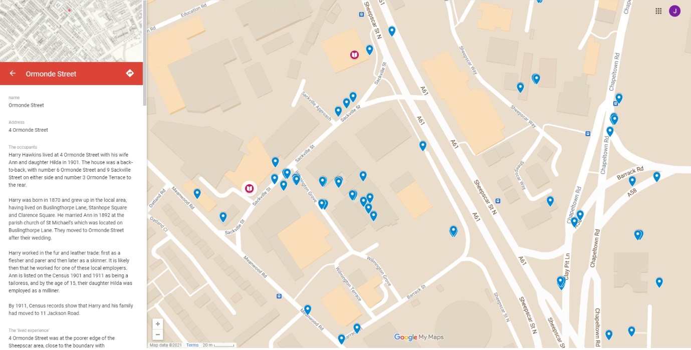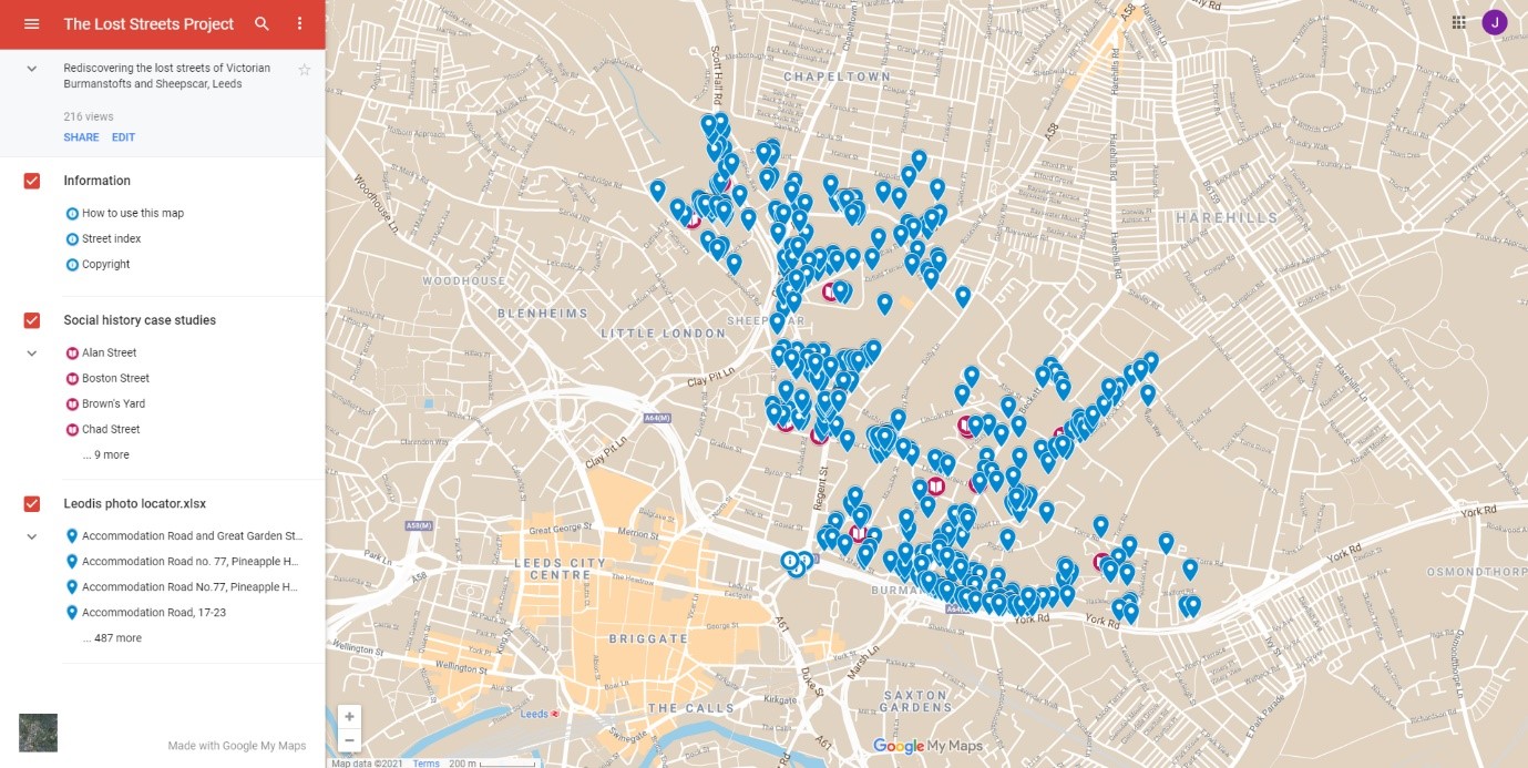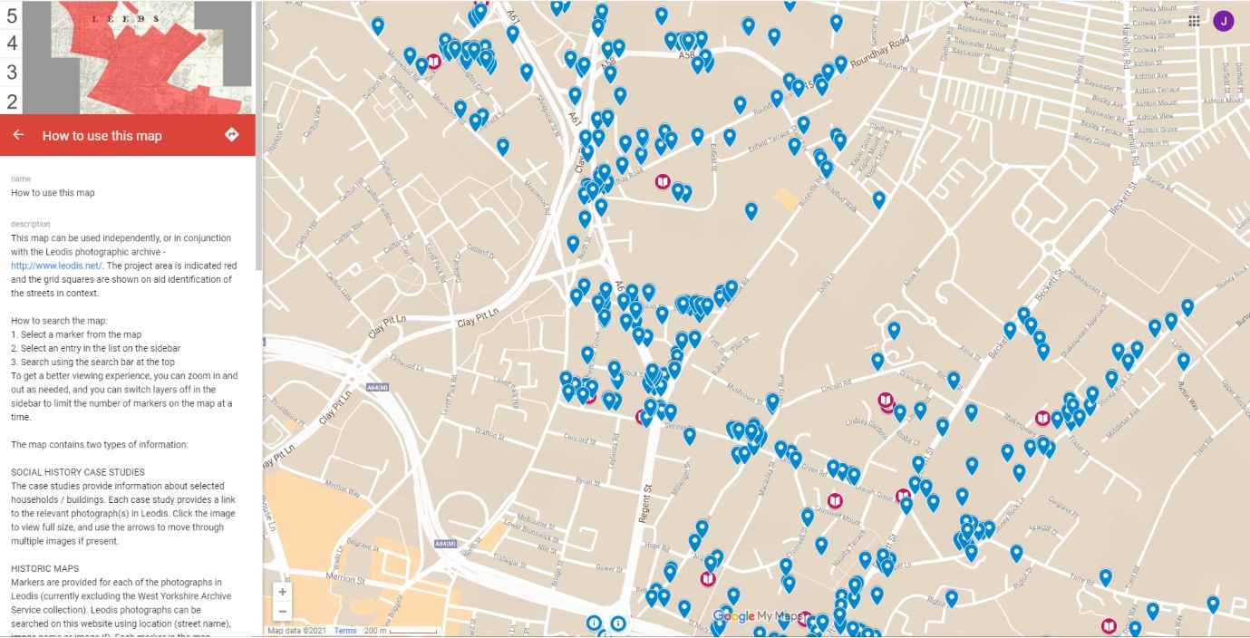 There is the obvious element of the unknown in research projects, and despite meticulous planning, that was true of this project in terms of its size. Firstly, a search for Burmantofts or Sheepscar on Leodis does not return all photographs for the neighbourhoods. Some streets that were in Burmantofts for example, were categorised as Lincoln Green, the current name for part of that neighbourhood. The cumulative effect of such examples meant that instead of an expected project size of around 800 photographs, there were in fact over 2300! With the funding and time available, it was simply not possible to expand the project to incorporate the total number so we had to prioritize our resources for maximum benefit. We excluded the West Yorkshire Archive Service (WYAS) photographs from the mapping part of the project because WYAS hold maps in their physical archive that indicate the position of each of their photographs, and therefore the information is available somewhere at least. With the Covid-19 lockdown, it was not possible to visit the archive, and it made little sense to spend time mapping what already exists. Should funding become available in future, it will be straightforward to add them to the project website. This adjustment significantly reduced the mapping part of the project, but we then encountered another demand on our time because of the Leodis archive update. As part of the project process, we had recorded the photographs in spreadsheets with their respective web addresses so they could be linked with the new Lost Streets website. Unfortunately, unbeknown to us, the new Leodis website which went live two months into the project, used different addresses for the photographs, so they had to be redone! There were lots of other technical challenges with the project which arose because the research was divided between the workshop participants. It meant there was a certain amount of duplication built into the project that couldn’t be filtered out until the final stages when buildings were marked on historic maps. The process of mapping the locations on the current map was also complex to design, but the use of GIS software enabled co-ordinates to be exported to the Lost Streets website.