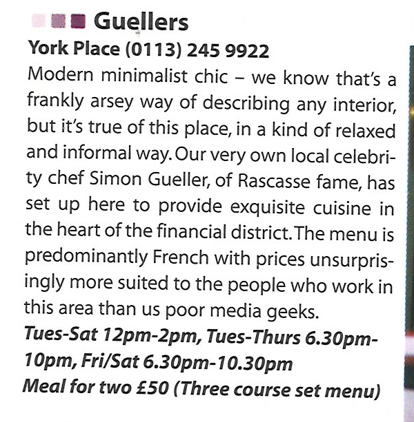 It’s kind of the same situation with Guellar’s next venture: called Guellar’s, as we’ve already heard, based at York Place and described by that YP from 2019 article as having gained a Michelin star in 2002. The Itchy Leeds guide from 2002 doesn’t mention Guellar’s as having got a star, though it may have been published before the Michelin guide came out that year.