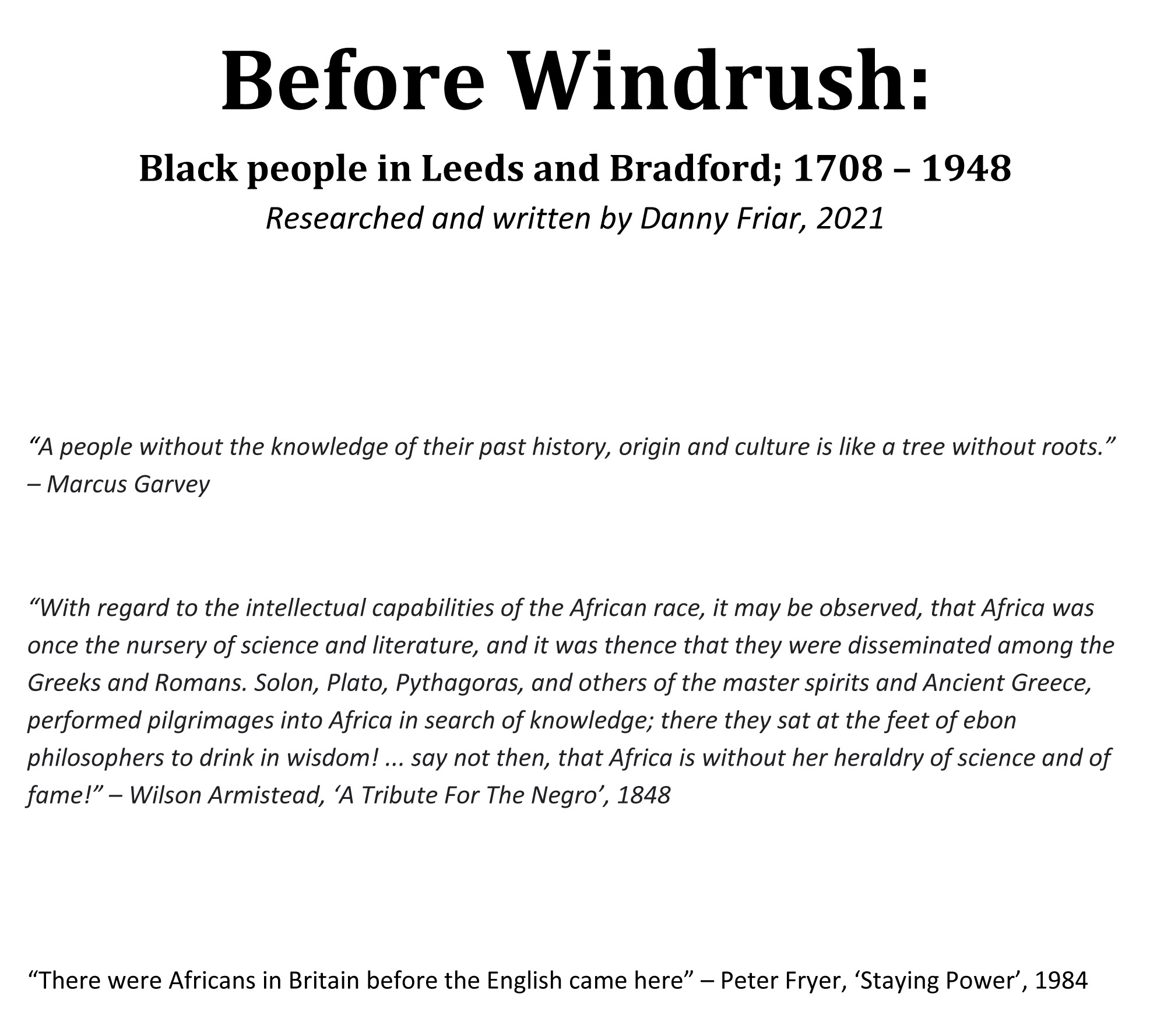 This week the Secret Library blog is delighted to welcome back local historian and researcher Danny Friar whose four articles during Black History Month told the story of Black people in Leeds and Bradford in the three centuries before the arrival of the ‘Windrush Generation’. This week, Danny has very kindly allowed us to publish the full text of that research. This is a major and original piece of local history research, which can also be accessed in hard-copy form in the Central Library in the near future. Click the image below to read the PDF, or view our dedicated Black History in Leeds page to see all Danny’s work along with other relevant articles.