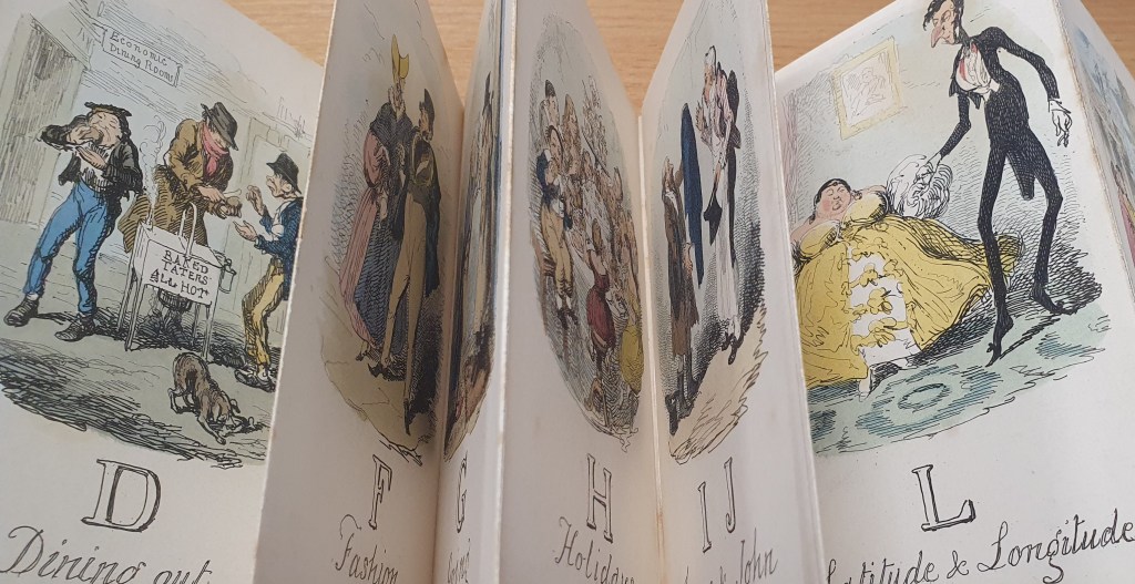 George Cruikshank was a caricaturist who began his career with satirical political cartoons and then later illustrated books, famously creating the images for Dicken’s Oliver Twist. Twist was first published in Bentley’s Miscellany which can be found in our collections. Cruikshank also published his own books including the Comic Almanack and the very charming concertina Comic Alphabet that consists of twenty four images.