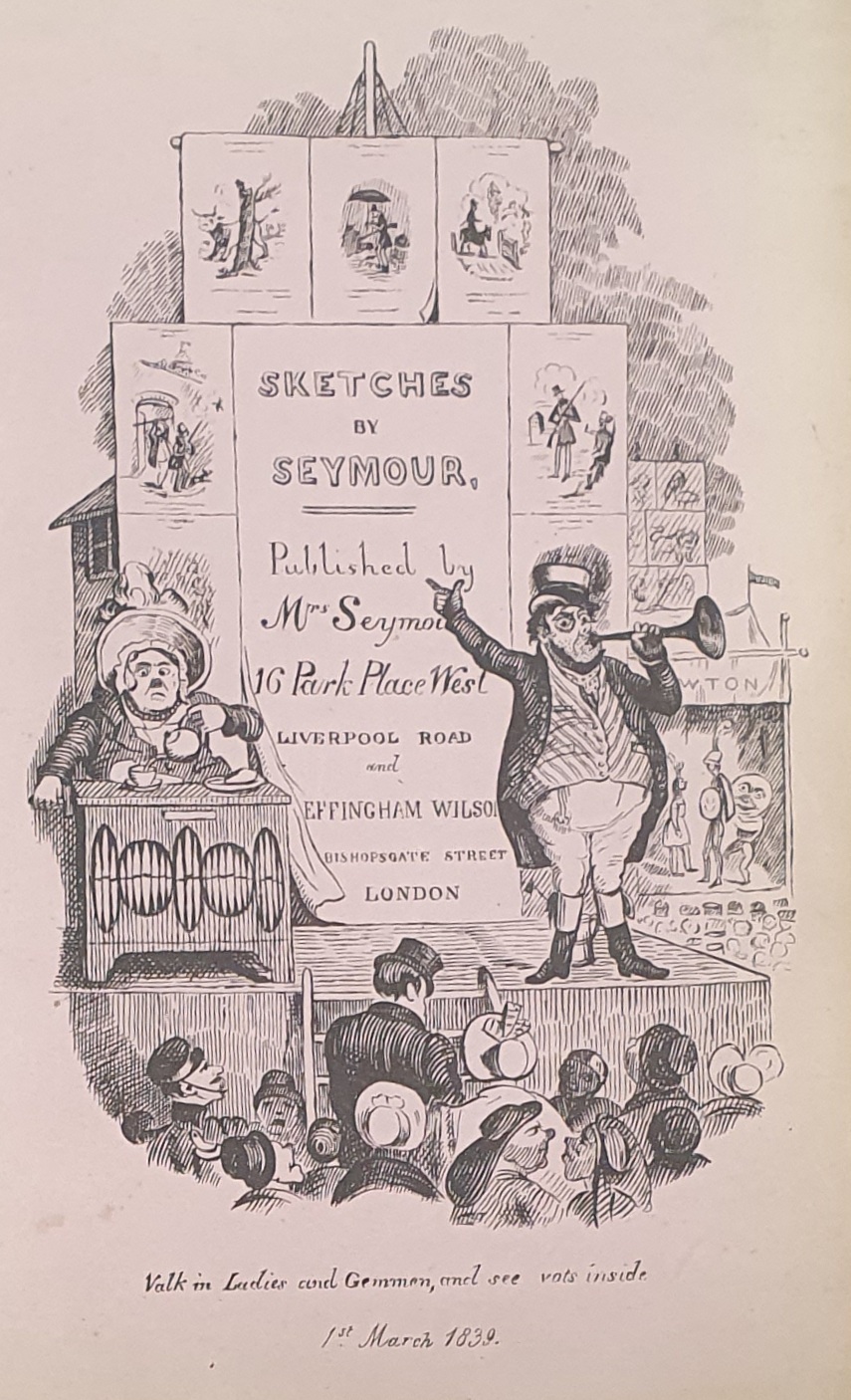 The two most celebrated comic artists of the era were Robert Seymour and George Cruikshank. Seymour was a satirical cartoonist who specialised in sporting subjects. He was the first illustrator of Charles Dickens’ Pickwick Papers producing seven plates before his suicide in 1836. We have a box full of loose individual prints of Sketches by Seymour which were originally published between 1834 and 1836 and sold for 3 pence each, by Richard Carlile. Carlile retained the copyright and the images were later published in bound volumes. Our copies are dated from around 1835 to 1850.
