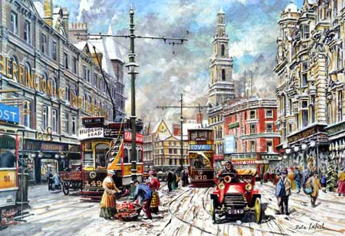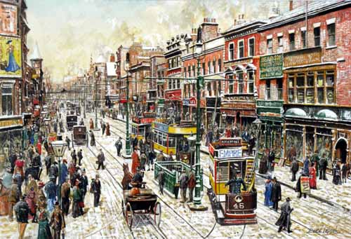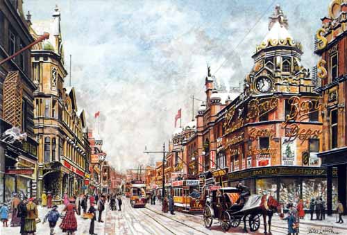 Impressionistic watercolours by Yorkshire Artist Pete Lapish, his series of wintery ‘tramscapes’ were originally painted as a Christmas card commission. These images are set between 1900 and the 1950’s showing off Leeds beautiful heritage architecture of Victorian and Georgian brick buildings.