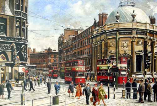 c1953. View of Boar Lane from City Square, depicted on a snowy winter’s day . A Horsfield tramcar is proceeding into Boar Lane on route 3 to Roundhay. A Chamberlain car is about to enter the loading area to pick up passengers travelling in the direction of Kirkstall. At the left edge part of the Royal Exchange buildings can be seen and on the right the domed building is the Midland Bank at the corner of Boar Lane with Bishopgate Street. The group of people in the foreground are just entering City Square.