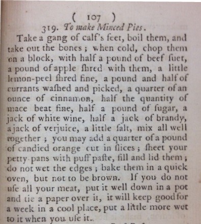 In her preface Peckham states – ‘the following collection of receipts in the art of cookery, the result of above forty years practice in the best families in and about Leeds, is not stuffed with a nauseous hodge-podge of French kick-shaws; and yet the real delicacies of the most sumptuous entertainments are by no means neglected’ and ‘such mistresses as think it a burden to be continually dangling after their maids in the kitchen, may be exempted in a great measure from that trouble, by putting these rules into the hands of their servants; for special care is taken to make everything easy and intelligible to the meanest understanding’. Peckham was proclaimed to be ‘one of the most noted cooks in the country of York’ so it seems only fitting that we show you her recipe for some traditional mince pies made using a ‘gang of calf’s feet’.