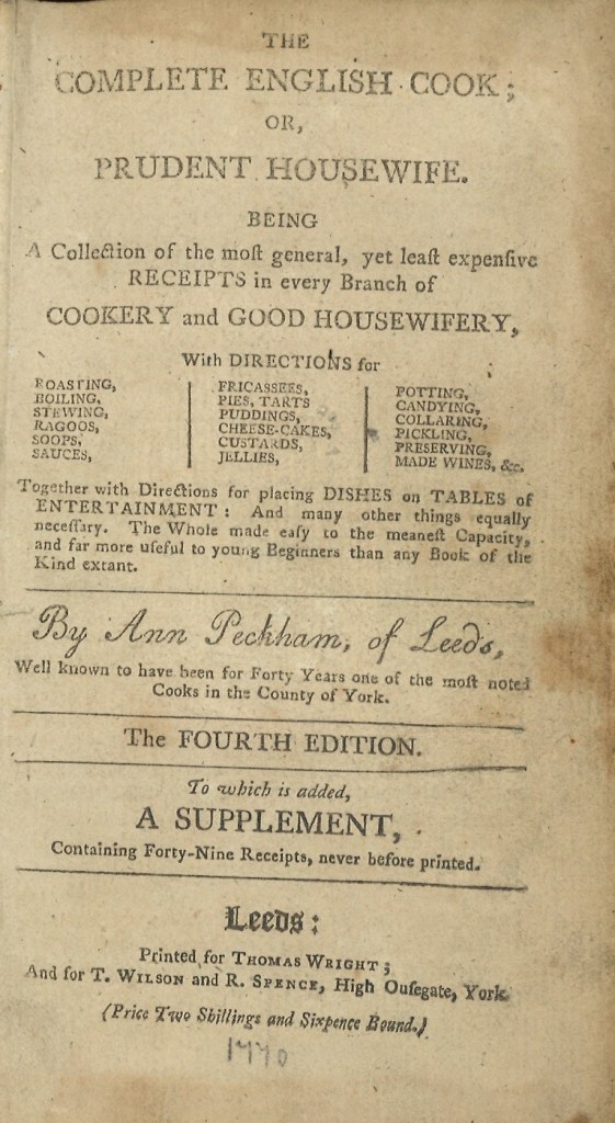 Ann Peckham was from Leeds and wrote a book entitled ‘The complete English cook or prudent housewife’. Our copy shown here is the fourth edition dating from 1770.