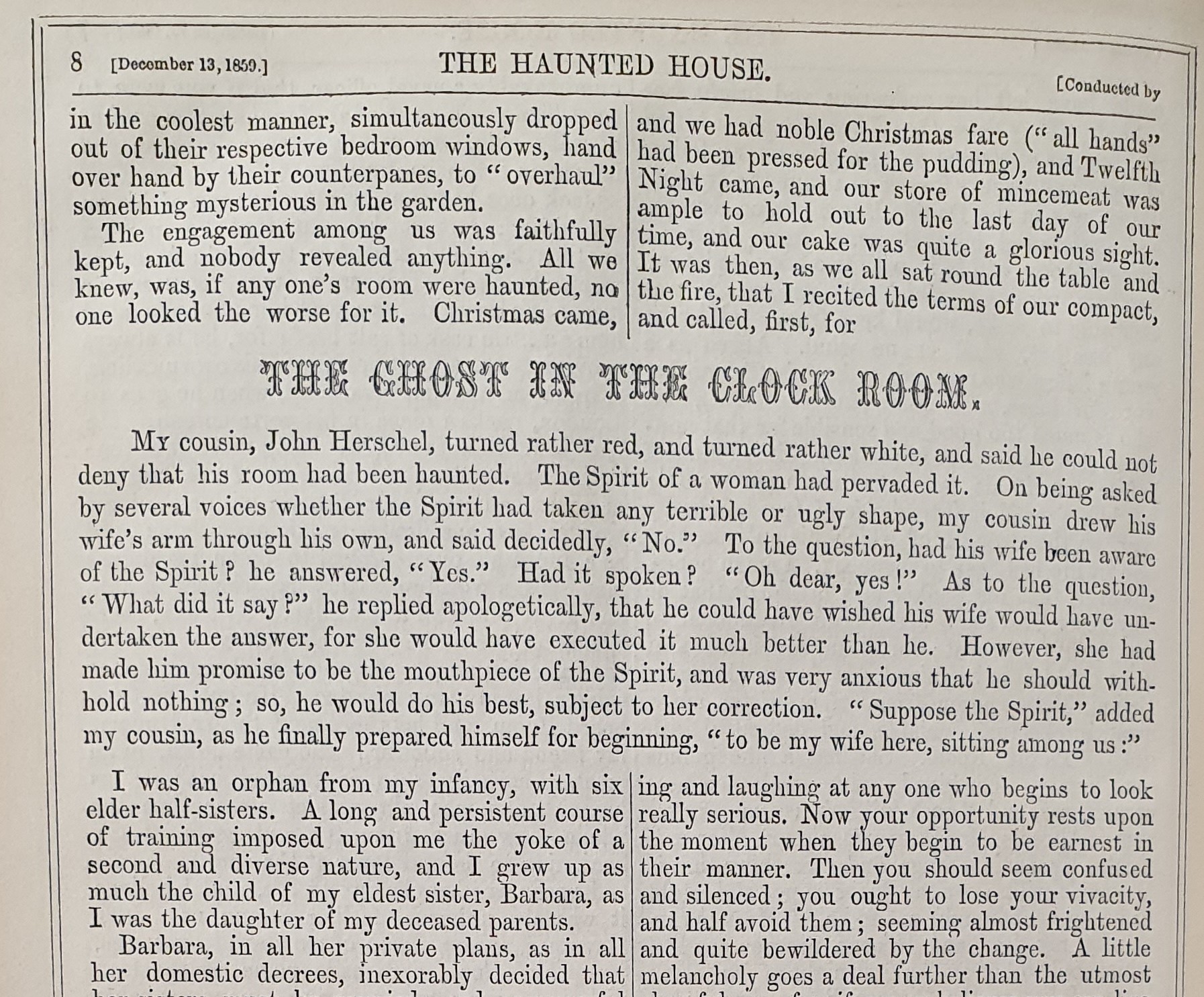 In 1852 Dickens invited Elizabeth Gaskell to contribute to the Christmas issue of Household Words’ and here we find the chilling ‘Old Nurse’s Tale’. Dickens described it ‘as a very fine ghost-story indeed. Nobly told, and wonderfully managed’ although he couldn’t resist proposing a change to the ending which she rejected. The Haunted House was another of Dickens’ contributions to the festive ghost story tradition. This was a collaboration with Elizabeth Gaskell and Wilkie Collins and was published in the 1859 edition of All The Year Round.