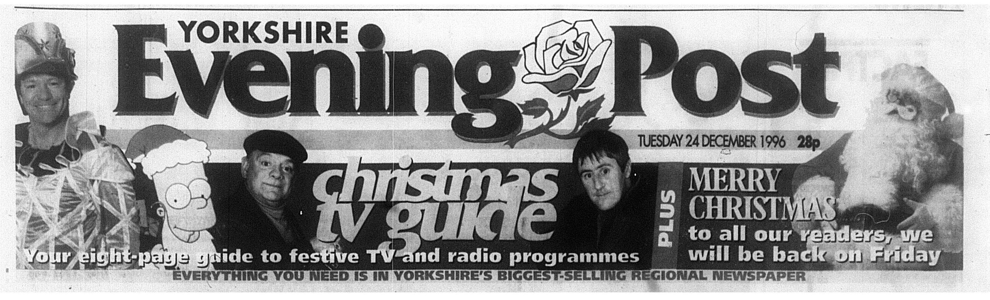 We start with the Yorkshire Evening Post front page from December 24 1996 – Christmas Eve, twenty five-years ago. It’s sad to say, but there really wasn’t much festive cheer in this edition of the YEP…this brief mention in the banner headline is the closest readers got to a seasonal message.