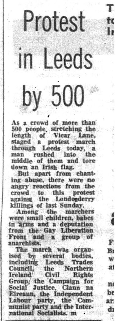 the Leeds march was organised by the Northern Ireland Steering Committee and stretched the length of Vicar Lane, then marching along Boar Lane in the direction of City Square, before finally gathering at the Garden of Remembrance. Attending the march were representatives of Trade Unions, Irish organisations, political parties, the Leeds branch of Clann Na hEireann, the Campaign for Social Justice, the International Socialists, and members of the Gay Liberation Front. Many students also joined, and police were present for the duration of the march.