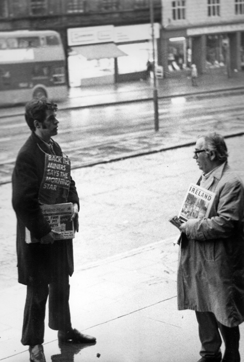 The image above shows two paper sellers in Leeds City centre engaged in a conversation. The man on the left is selling copies of the Morning Star, a left-wing tabloid newspaper which, until 1966, was known as ‘The Daily Worker’. As seen here, the Morning Star was in support of the National Union of Mineworkers during the strikes of the 1970s and 80s. The board strung around the young man’s neck states ‘Back the Miners Says the Morning Star’. At the time the photograph was taken the miners were part way through a seven-week strike for better pay. On the 9th of February 1972, the then Prime Minister, Edward Heath, imposed a state of emergency and a three-day week due to shortage of coal to fuel the power stations. The miners’ strike lasted from the 9th of January until the 28th of February 1972. The other man is selling copies of ‘Ireland’.