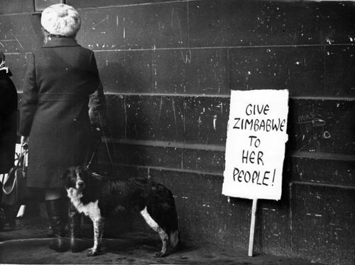 In the above image a protest banner leans against the wall reading ‘Give Zimbabwe to Her People’ as in that year guerrilla warfare against white rule and the fight for independence had escalated.