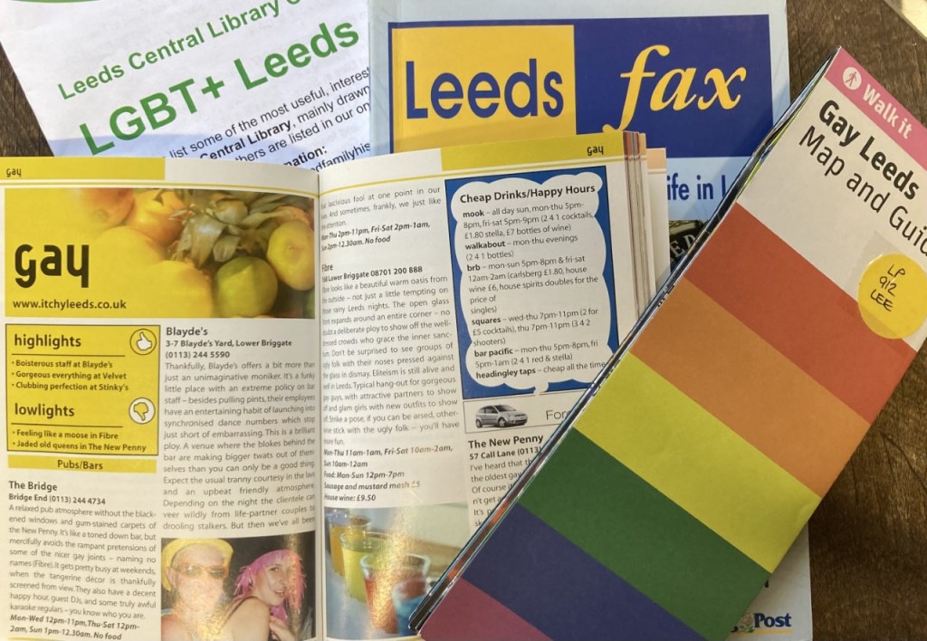 The library holds many guides to Leeds – listing attractions, restaurants and nightlife. Gradually, LGBT+ events and venues began appearing in listings beginning with the Leeds Other Paper and then came the publication of Shout: West Yorkshire’s free monthly listings paper for the lesbian, gay and bisexual community. The library only has a few copies of this magazine from February – April 1996 and they are held at YQ 306.76 SHO. Later publications such as the Itchy Guides to Leeds (L914.2819 ITC) and Leeds Fax (L 914.2819 LEE) included a ‘Gay’ section and in 2001 a Pocket Guide to Gay Friendly Leeds was published by the Lesbian Gay Bisexual Switchboard (LP 306.76 POC). In 2010 a Gay Leeds Map and Guide was produced by Leeds City Council (LP 912 LEE).