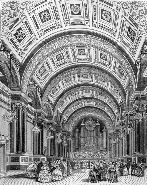 1858 Engraving by O. Jewitt showing Victoria Hall within Leeds Town Hall. The organ can be seen at the back of the hall. Copyright Leodis.net