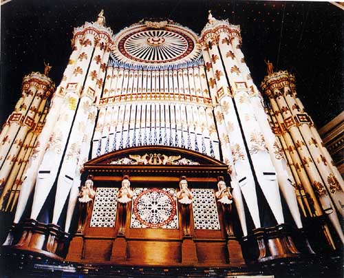 After his death in 1897, Spark was succeeded by Herbert Fricker, who held the post until 1917. But by now the municipal organ was declining in popularity – the rise of the gramophone meant that first-class performances of orchestral music could be enjoyed at home, and there were other competing entertainments such as the cinema. Although the choral tradition remained strong, the City Organist post remained unfilled after 1917. Through the 20th century the use of the organ gradually declined, and its upkeep became neglected. This wasn’t just because of the considerable expense: the very idea of the Victorian concert hall organ had become unfashionable alongside the entire Victorian aesthetic. The highly decorated appearance of the organ, and the hall itself, were also victims of this change in fashion – the hall was repainted largely in white and the organ took on a pastel scheme in a sort of Art Deco style. Fashions in organ building had changed too, moving away from complexity and rich orchestral colours to a leaner and clearer sound thought more appropriate to Bach and earlier composers – the days of playing orchestral transcriptions were believed to be long gone. So from the 1950s the Leeds instrument became increasingly unreliable, and eventually it could only be used with an organ tuner on standby inside the instrument to rectify the all-too-frequent mechanical problems. By 1968 the instrument was abandoned and stood silent, a slightly embarrassing monument to a lapse in taste. And Leeds was not alone – a similar fate eventually befell many other concert hall instruments, and some have never recovered: Middlesbrough, Newcastle, and Bradford, among others, have halls where the organ remains a prominent visual feature but has stood unused for years.