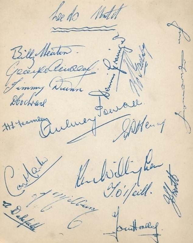 While the majority of those treasures cover the period following the 1961 appointment of Don Revie as manager, earlier material is also present. Of particular note is an autograph book containing signatures of players during the 1947-48 season. Autographs and signatures of players form a large part of the Central Library LUFC treasures, in fact, including books signed by legends from the 1960s and 1970s; a short autograph book from the mid-1990s; and several autographed cards and posters.