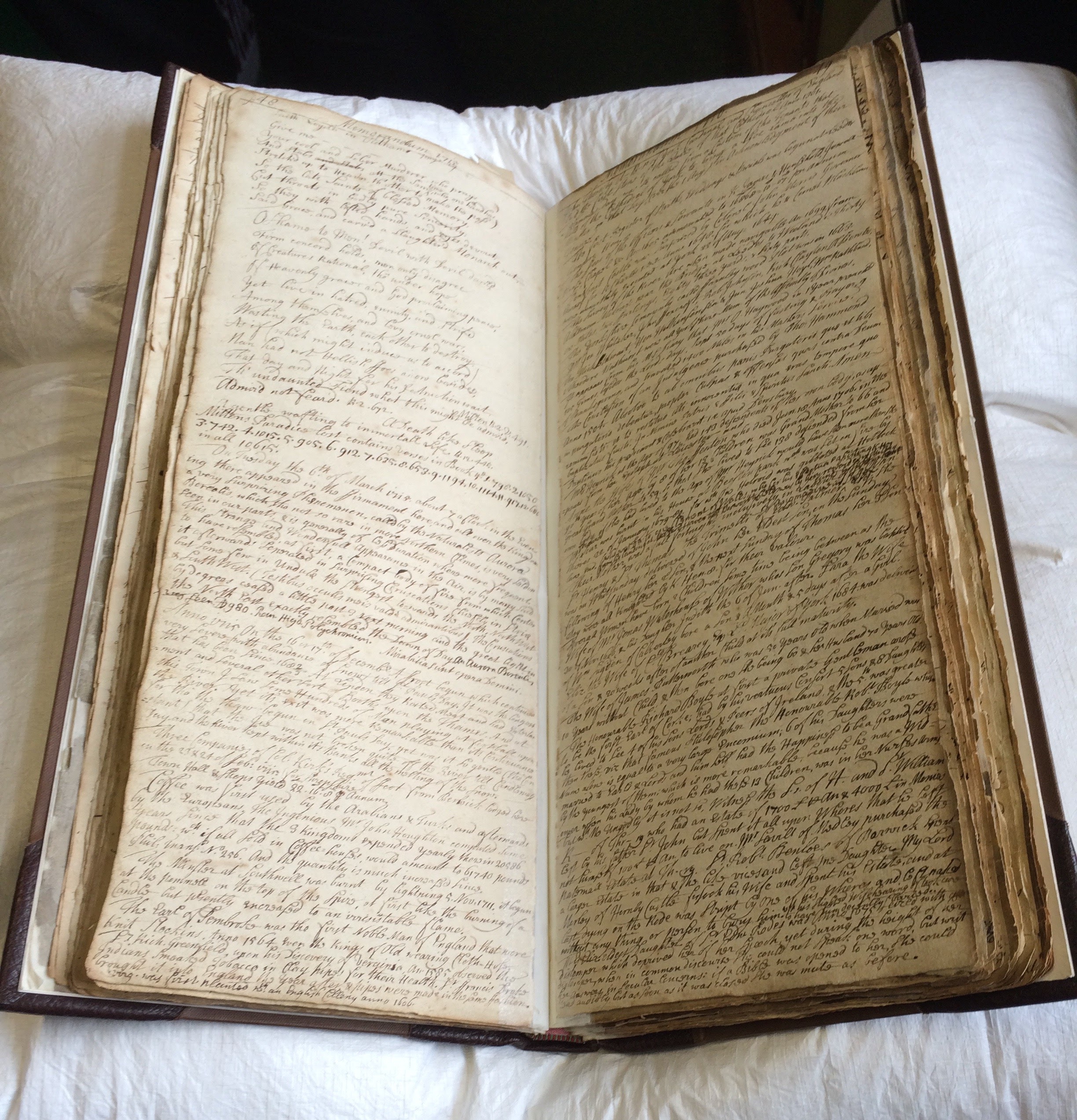 Though often mainly a record of national events, the Memoranda Book also captures important occurrences in Leeds itself: celebrations for the Peace of Utrecht, horse racing at Temple Newsam, and in December 1715 the first record of ‘football’ being played in the town. Alongside those particularly eye-catching events are numerous accounts of everyday life: accidents, deaths, asides about the weather, business and political disputes, meals and celebrations, unusual occurrences of all kinds: visceral accounts of daily life, in short.